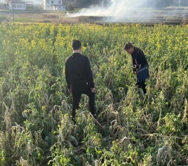 科技服务队对接农业农村部科技小分队联合出台技术措施,一是及时清沟理墒,降低田间湿度,预防冻害后软腐病、黑腐病等细菌性病害侵害,同时减少对根系生长活力影响,利于油菜快速恢复生长;二是有劳动力地方立即摘除受冻茎、薹、叶,阻止冻害扩面;三是养分调控、及时追施氮钾肥,亩施尿素3-5公斤,氯化钾2-3公斤,补充植株茎、薹、叶损伤后营养流失,促进腋芽和分枝萌发,降低损失;四是开展油菜“一促四防”工作,油菜受冻后易导致裂口损伤,硼吸收受阻,进一步发生“花而不实”和菌核病,及时开展油菜“一促四防”工作是关乎我省冻灾后保产、稳产、增产关键技术措施;五是加强蚜虫及后期倒春寒、冰雹等不利因素监测和预报,密切注意各种灾害发生发展动态,及时开展防灾、减灾工作。